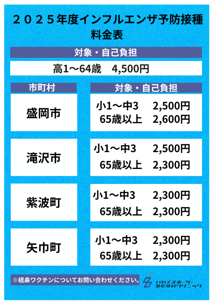 ※経鼻インフルエンザワクチンは対象年齢や入荷制限、金額が異なりますので直接ご相談ください。